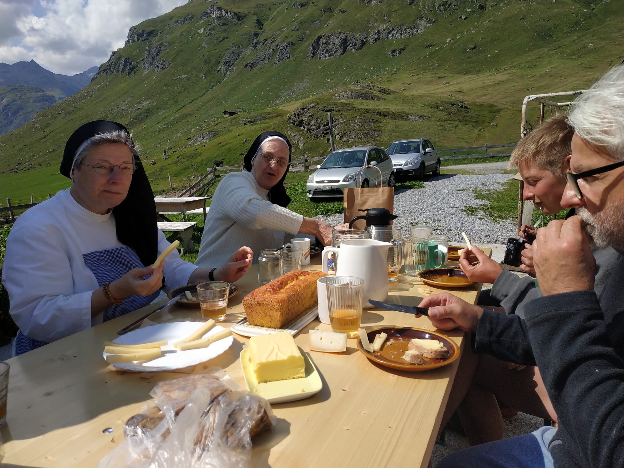 Sr. Imelda, Sr. Priska, Sr. Nicola und Sr. Manuela besuchten unsere Alp, auf der feiner Käse produziert wird. Doch zuerst geht der Ausflug auf die Alp Flix für einen Spaziergang zu der Kapelle Son Roc, einen guten Ort für das Mittagsgebet. Und da der Mensch nicht nur vom Gebet lebt, geht es zum Mittagessen im nahen Restaurant.