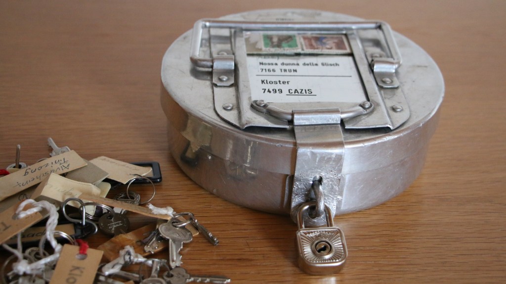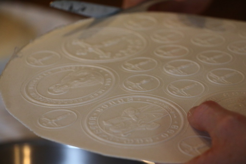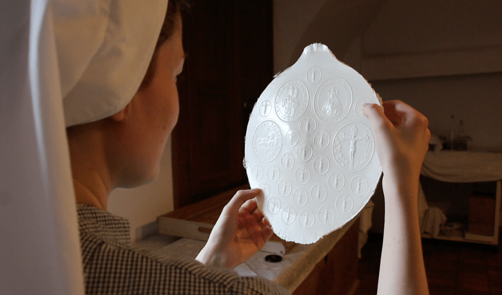 Das Hostien Backen ist eine alte Handwerkkunst, die bei uns von Schwester zu Schwester weitergegeben wird. Früher backten unsere Schwestern bis zu 10’000 Hostien pro Woche, die sie dann in mit einem Schloss versehenen Metallkassetten an 10-15 verschiedene Pfarreien per Post versandten. Der jeweilige Sakristan besass den Schlüssel, um das Schloss zu öffnen. Dieses Vorgehen zeigt uns auf, mit welch hohem Respekt und mit welch grossem Sicherheitsbedürfnis auch nicht konsekrierte Hostien behandelt wurden. Damit wollte man vermeiden, dass man Gefahr lief, dass nicht konsekrierte Hostien in Umlauf gebracht wurden. Ein weiteres Sicherheitssiegel waren eingeprägte Motive, in den Hostien. Das Motiv diente nicht nur zur Andacht, passte zum Festtag oder zu den geprägten Zeiten (Fastenzeit, Weihnachtszeit etc.), sondern diente auch wiederum als Echtheitszeichen, um Fälschungen zu identifizieren. Denn so war sofort klar, woher sie kamen. Hostien könnte jeder backen und ausstechen, doch für geprägte Motive braucht es Hostieneisen, die ein normaler Haushalt nicht besass, sondern die in der Regel nur Klöster hatten. So konnte verhindert werden, dass von nicht geweihten und autorisierten Personen Pseudomessen gefeiert wurden, eine sogenannte simulatio sacramenti.