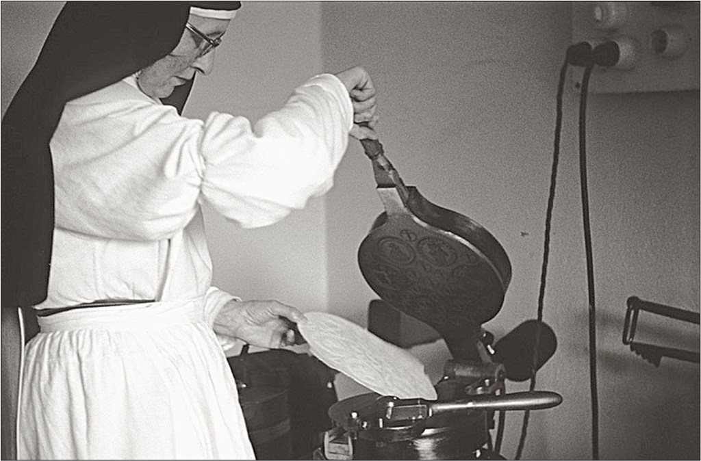 Mit dem Hostieneisen aus dem Jahre 1933 werden dann die Hostien von Hand gebacken. Es soll in Stille und Gebet verrichtet werden. Denn wir glauben, dass in der Messe während der Wandlung die Hostien zum Leib Christi werden. Dies ist ein grosses Gnadengeschenk, dass wir täglich mit dankbarem und reinem Herzen empfangen dürfen. Nicht umsonst heisst Eucharistie übersetzt «Gute Gnade», Dankbarkeit, Danksagung (Eu-charistia). Der Heilige Albertus Magnus, ein Dominikanertheologe und Kirchenlehrer aus dem Hochmittelalter, schreibt in seinem Werk «Über den Leib des Herrn» Folgendes: «In der Eucharistie ist alles Gnade, was wir sehen, berühren, verkosten.“
