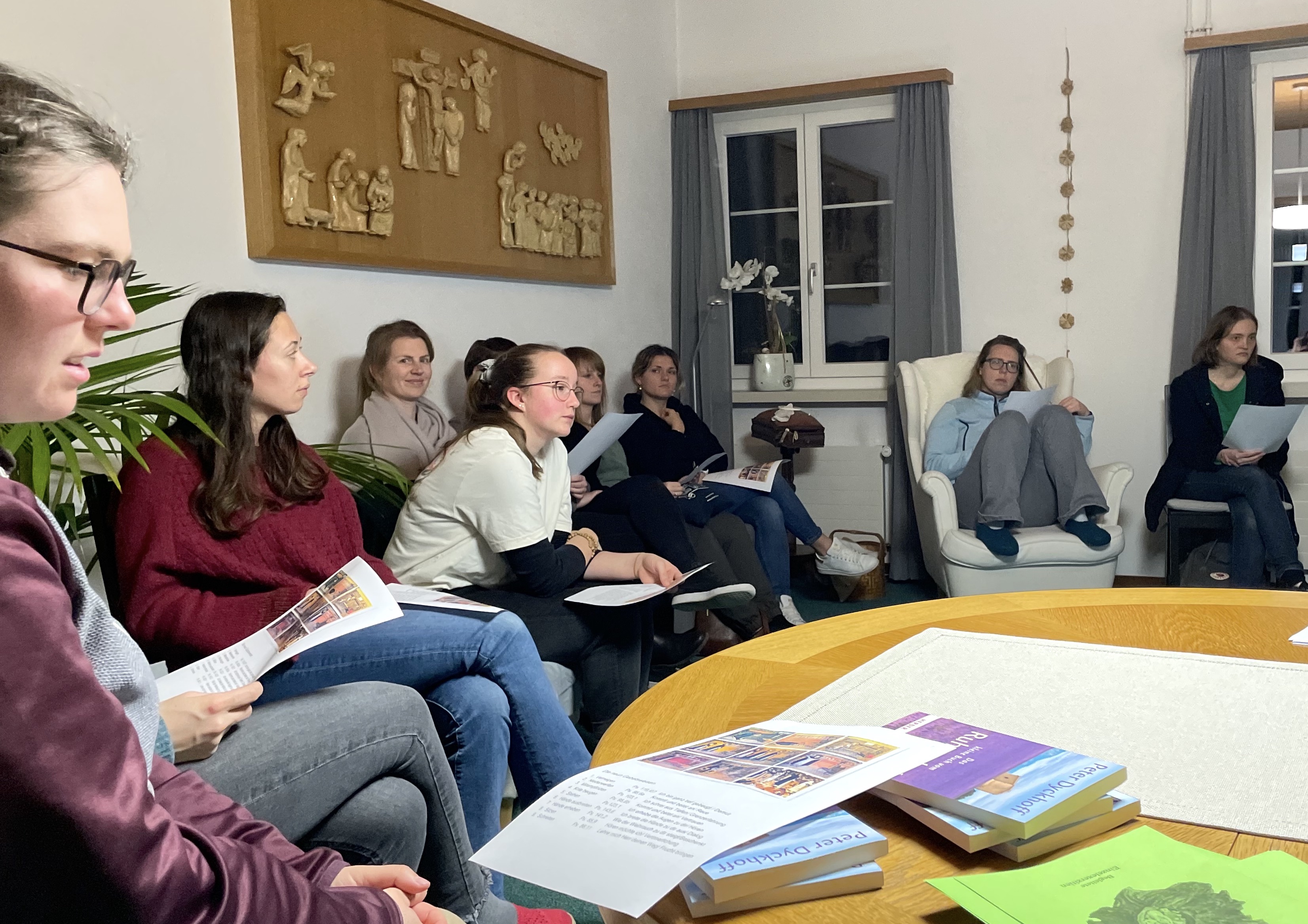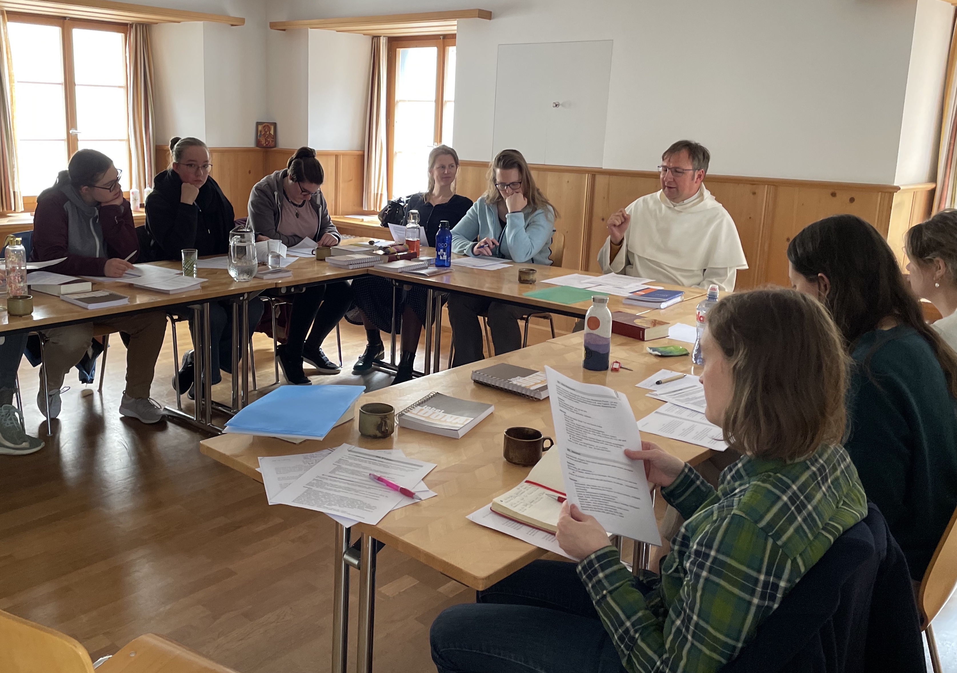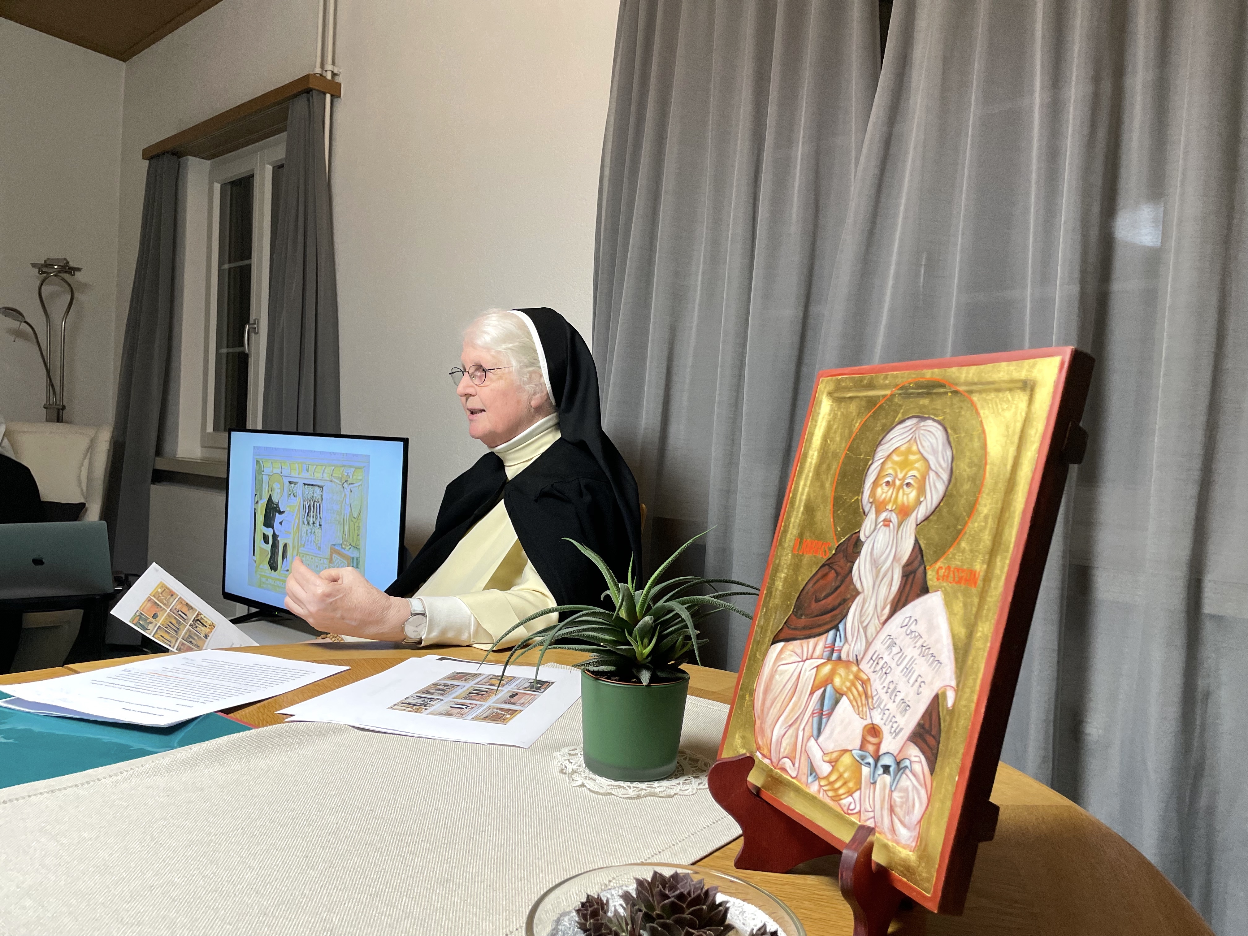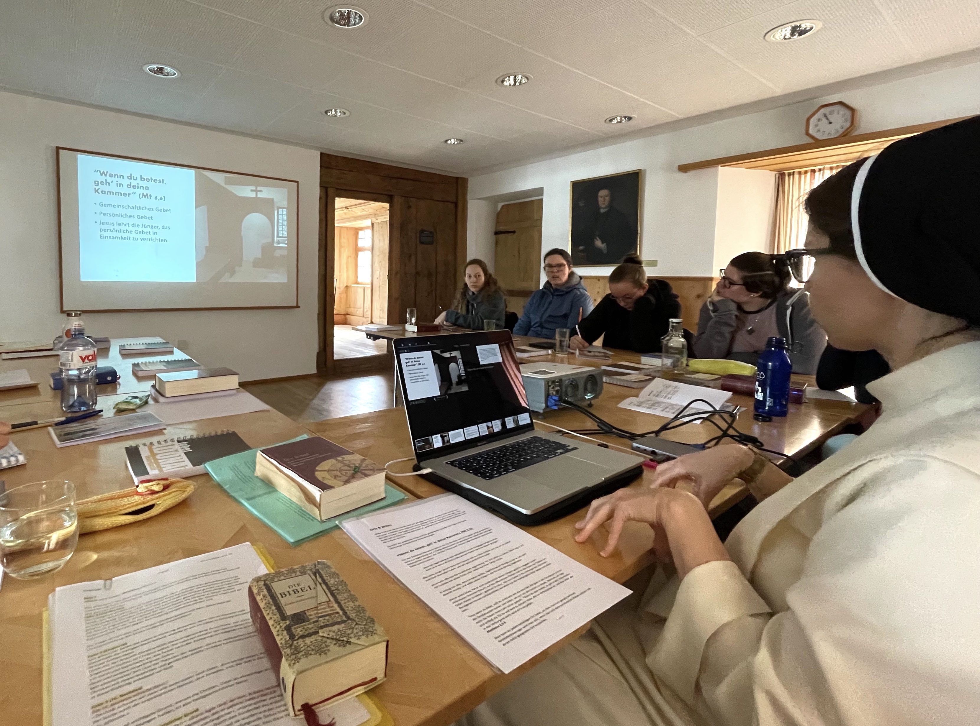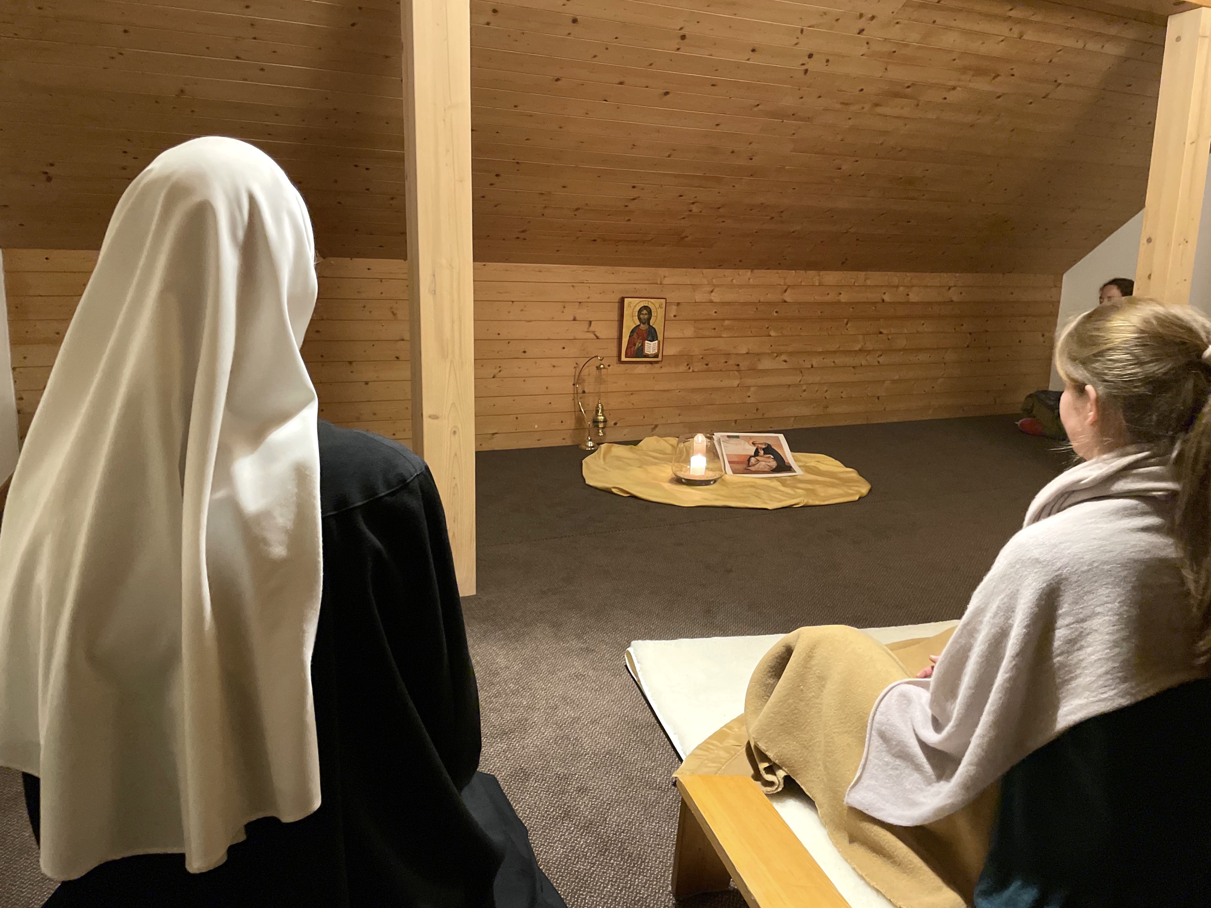 Wir vertieften uns in die verschiedenen Gebetsweisen anhand des reichen Schatzes der Wüstenväter. Wir lernten wann welche Haltung gemacht wird und was die Hintergründe sind. Auch eine Einleitung in das Ruhegebet mit Sr. Lea mit anschliessender praktischer Übung war ein Höhepunkt der Tage. Pater Thomas’ Einführung über die acht Lasterlehre hat es noch abgerundet. Sogar der Saharastaub, der am Samstag über die Schweiz fegte, passte perfekt zum Thema.