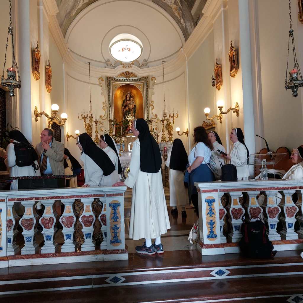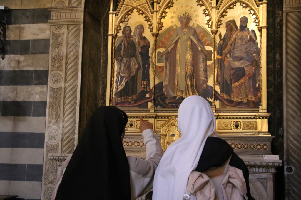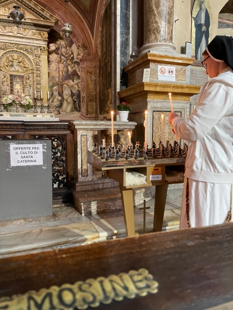 Aber der Reihe nach, es war nämlich ein sehr gnadenreicher Tag. Nach dem Frühstück haben wir uns das Heiligtum der Hl. Katharina angeschaut. Dort sind wir auf Suore Maria Beatrice getroffen auch eine Dominikanerin. Von ihr gab es gerade eine spontane Führung, auf Italienisch, aber dank Sr. Marias toller Übersetzung haben wir (fast) alles verstanden.