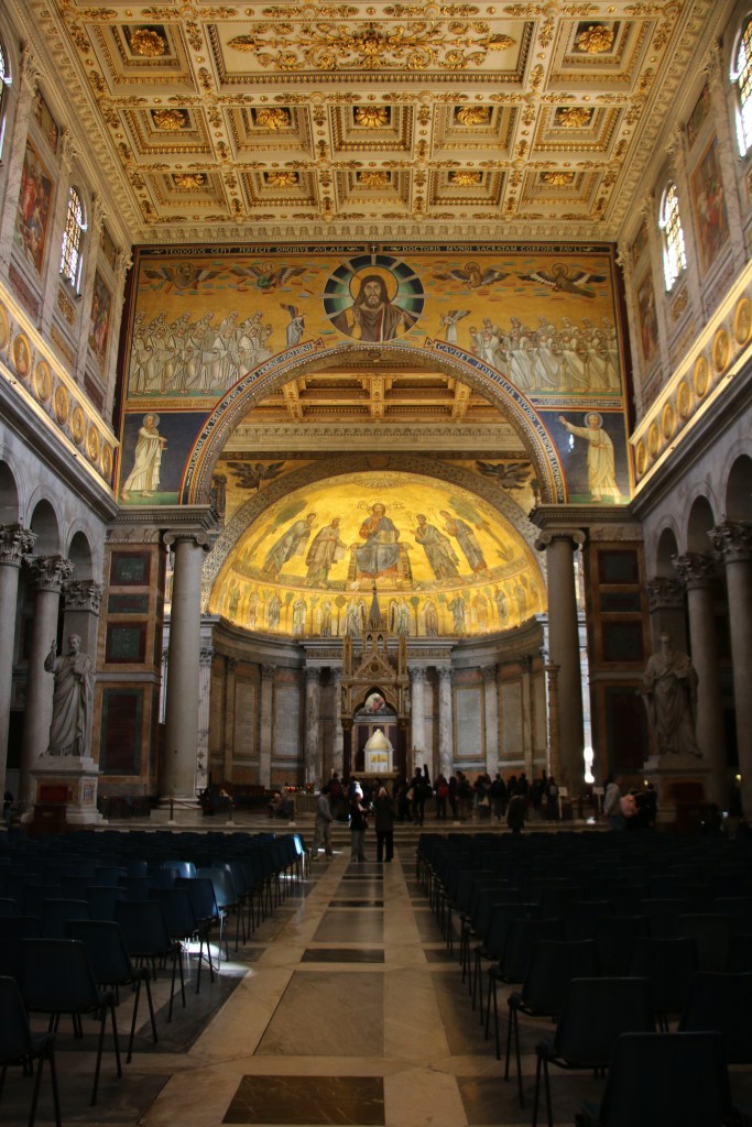 Am Nachmittag geht es weiter zur San Paolo fuori la mura. Das ist jetzt für uns nach dem Lateran und Santa Maria Maggiore die dritte der grossen Papstbasiliken. Jetzt fehlt nur noch der Petersdom, aber der kommt morgen. Wie es sich für römische Basiliken gehört, ist auch San Paolo eine kleine bescheidene Kapelle am Wegrand mit fast keinem Gold. Die Basilika ist über dem Grab des Hl. Apostels Paulus errichtet. Zudem gibt es an den Wänden Bilder von sämtlichen Päpsten, von Petrus bis Franziskus.