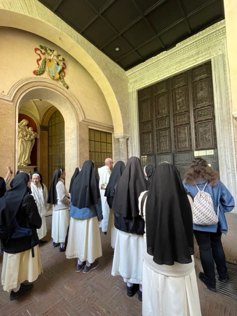 Nach dem Frühstück geht es los auf den Aventin zur Basilika Santa Sabina. Dort befindet sich die Generalkurie des Ordens, also das Büro des Ordensmeisters, leider ist er gerade im Ausland. Aber wir konnten immerhin ein Foto vor seine Bürotüre machen.