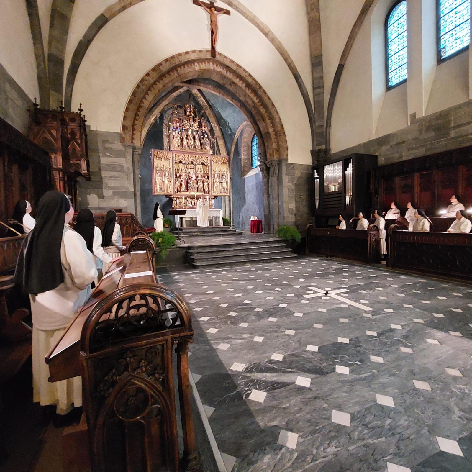 Auf dem Weg zum Mittagshore halten wir kurz für ein Gruppenfoto – ein schöner Moment, um unsere Freude festzuhalten. Doch die Zeit drängt, und wir müssen uns beeilen, um rechtzeitig zum Mittagsgebet zu kommen. In der Kirche St. Luzi besichtigen wir die beeindruckende Umgebung, und schließlich beten wir die Sext direkt beim wunderschönen Marienaltar.