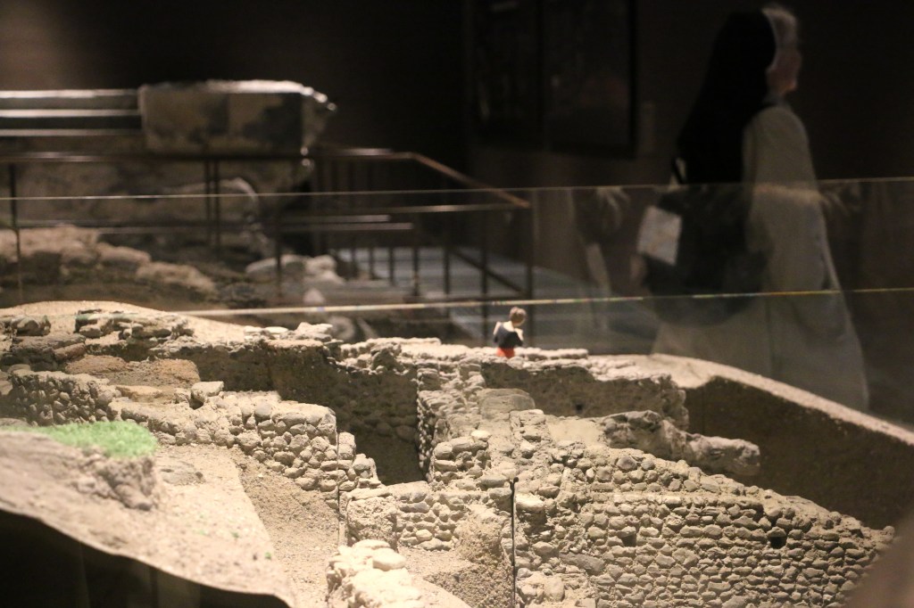 Anschließend erkunden wir die lange Geschichte des Christentums in Chur. Eine Studentin der Hochschule, führt uns durch die Ausgrabungen der Kirche St. Stephan, die sich unterhalb der Kantonsschule befindet. Diese archäologische Stätte ist eine wahre Perle der Stadt! Es ist ein großes Glück, dass wir sie besuchen dürfen, denn sie ist normalerweise nicht für die Öffentlichkeit zugänglich. Die Kirche St. Stephan wurde im frühen Mittelalter auf einem antiken Gräberfeld errichtet. Die leeren Gräber sind noch sichtbar, aber von den Fresken in der Apsis ist leider nicht viel übrig.