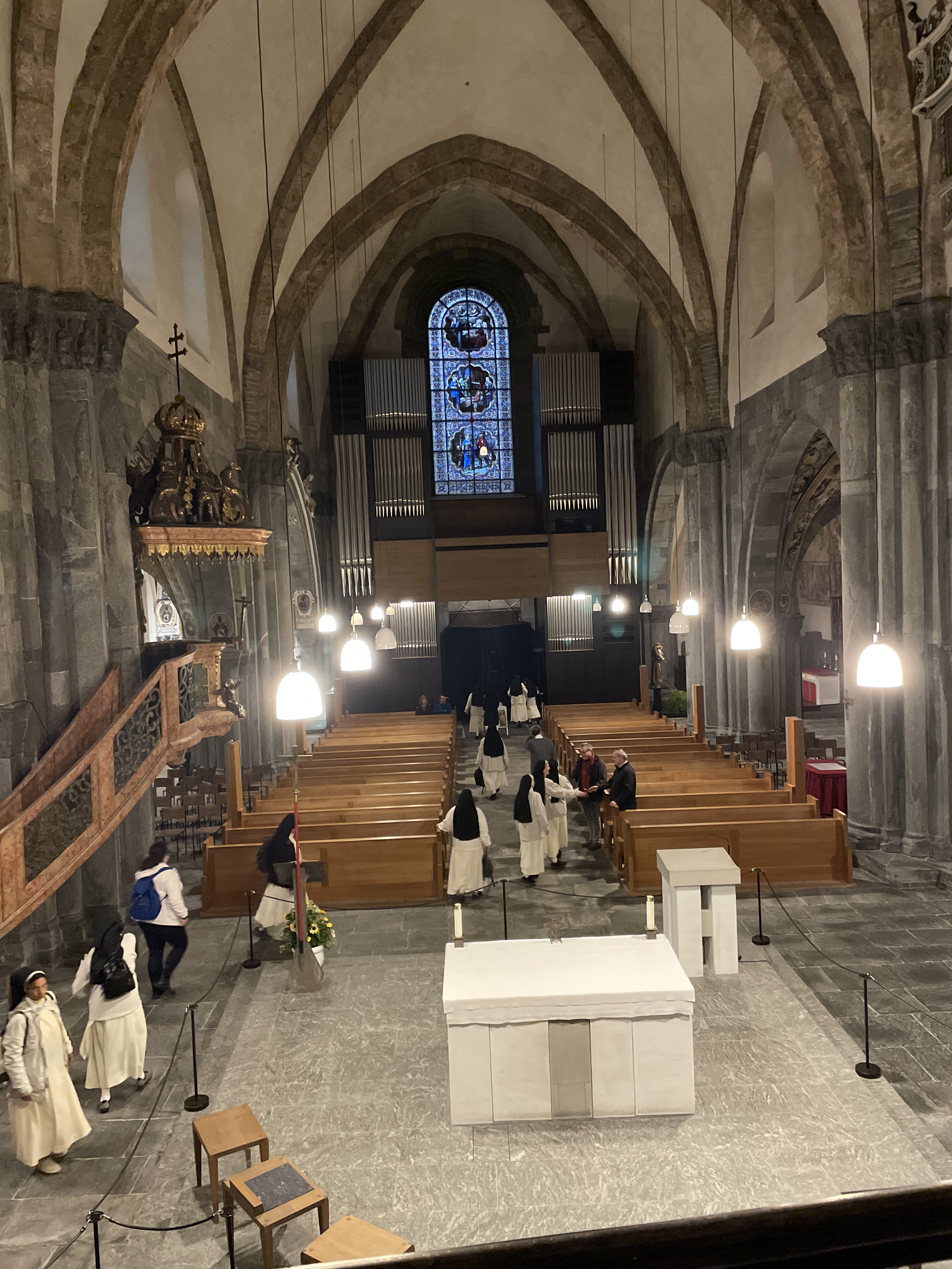 Um 16 Uhr hat die zweite Gruppe die Gelegenheit, das Domschatzmuseum zu besuchen, während die erste Gruppe die Kathedrale und die Altstadt erkundet. Fast pünktlich um 17:15 Uhr singen wir die Vesper im Chor der Kathedrale. Es ist etwas ganz Besonderes, auf den Plätzen der Chorherren zu sitzen. Sr. Maria begleitet das Gebet auf der Gitarre. Danach folgt der Höhepunkt des Tages: die Heilige Messe, die der Bischofsvikar am Hochaltar der Kathedrale zelebriert. Der historische Altar verleiht dem ganzen Geschehen eine besondere Bedeutung.