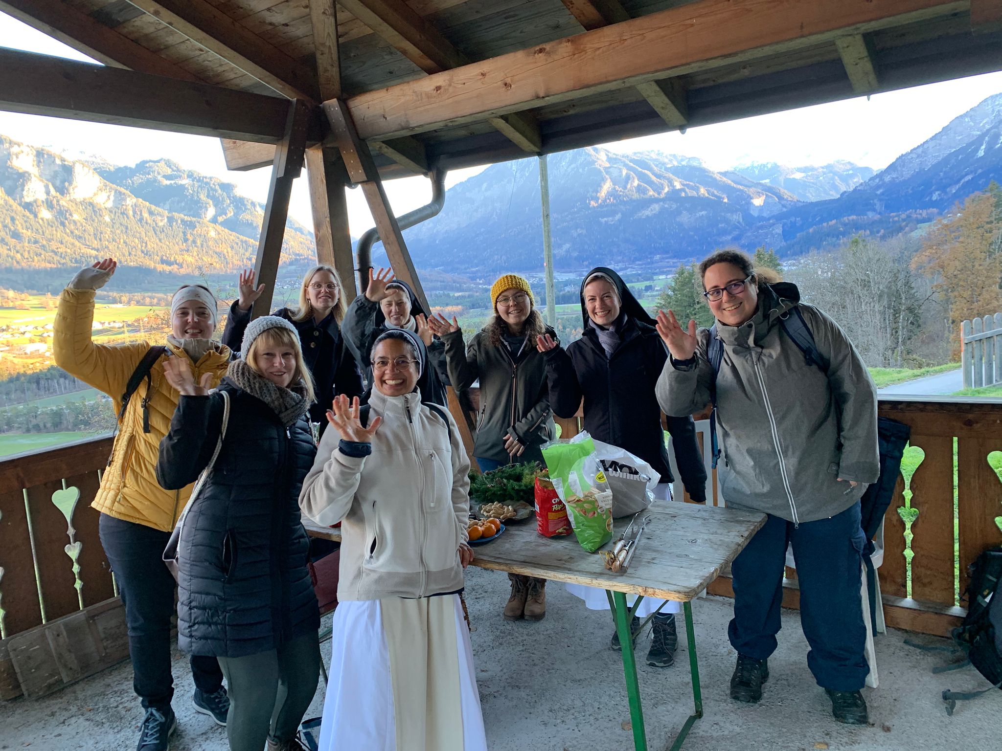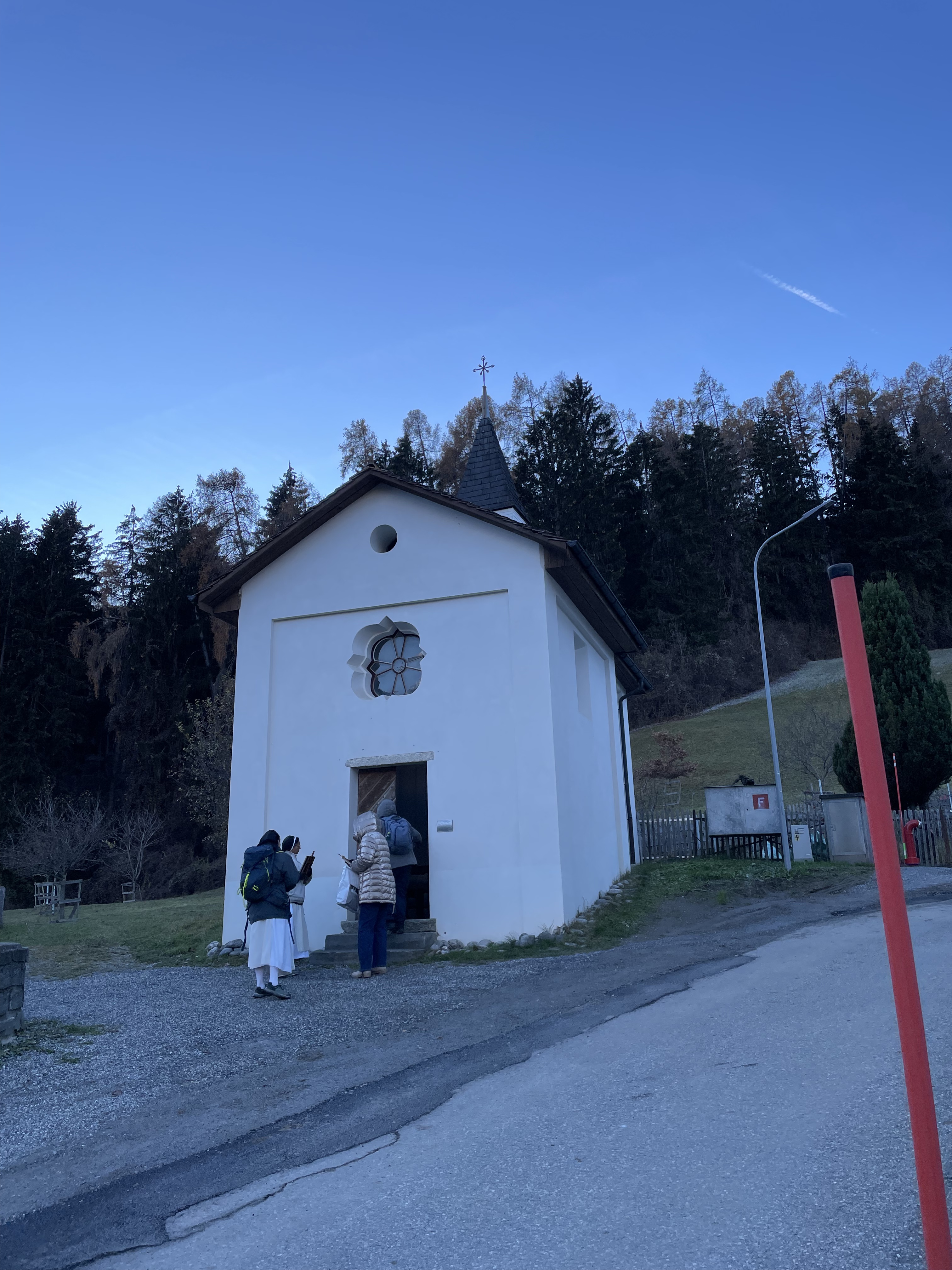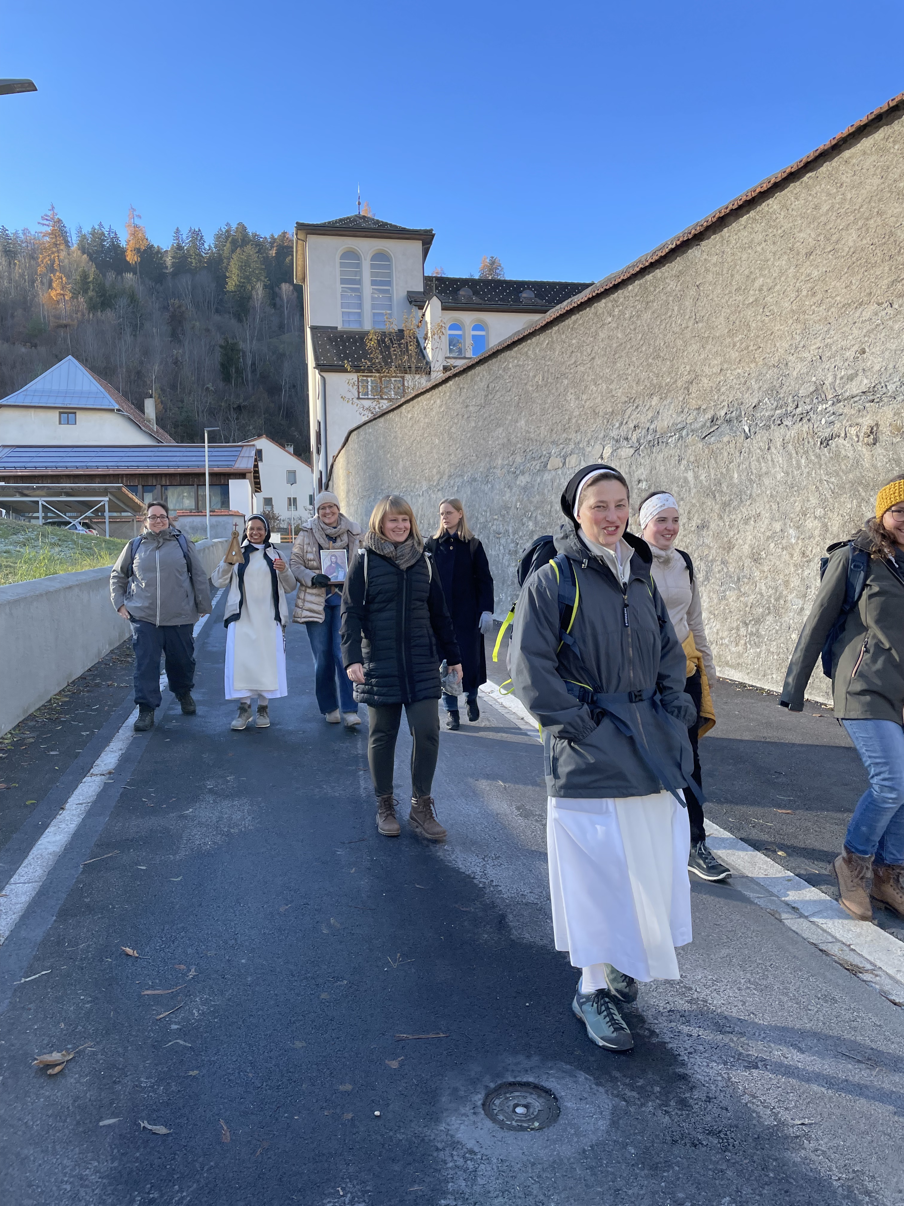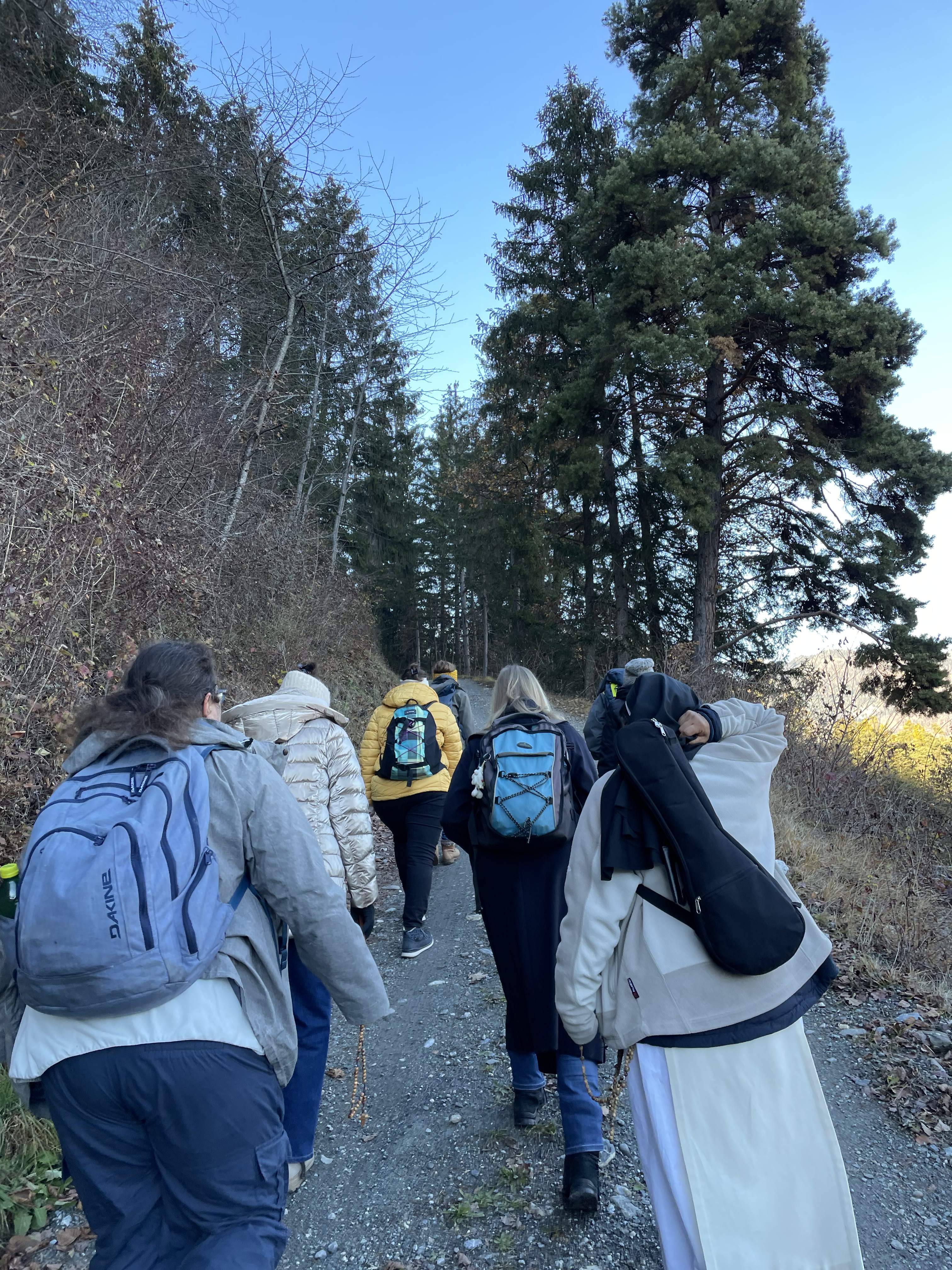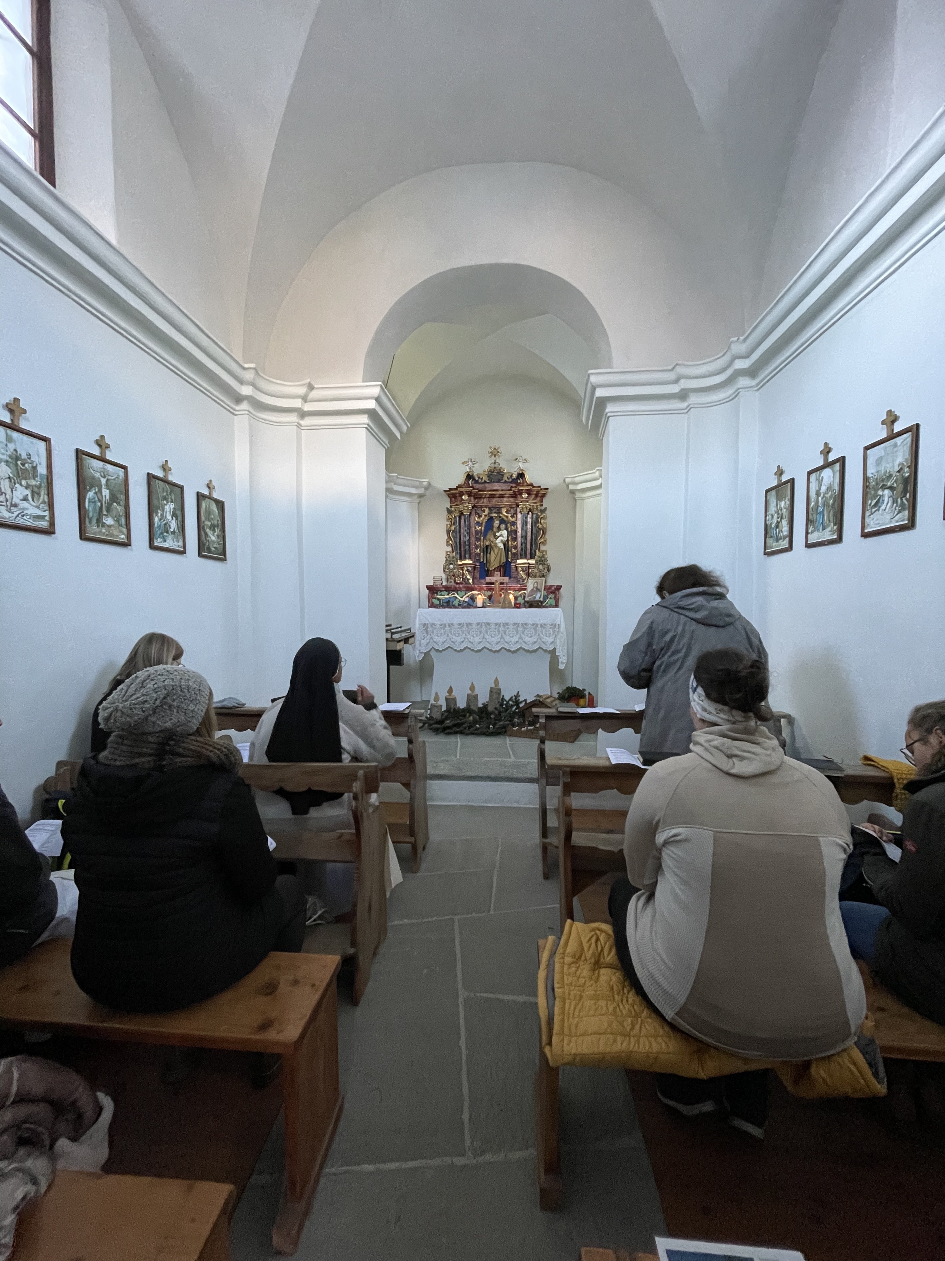 Am Nachmittag stand eine Wanderung zur Kapelle „Maria im Schnee“ in Luvreu auf dem Programm. Zunächst nahmen die Teilnehmerinnen an der Sext (Mittagsgebet) im Schwesternchor teil, bevor es nach dem Mittagessen losging. Der Weg zur Kapelle bot Gelegenheit, sich mit dem Thema „Buße“ auseinanderzusetzen – natürlich in Begleitung der Reliquie des Hl. Johannes. Nach einer Andacht mit einem spannenden Impuls zum Thema Busse, von unserer Postulantin Nicole, genossen wir eine wohlverdiente Stärkung mit Punsch und Chips.