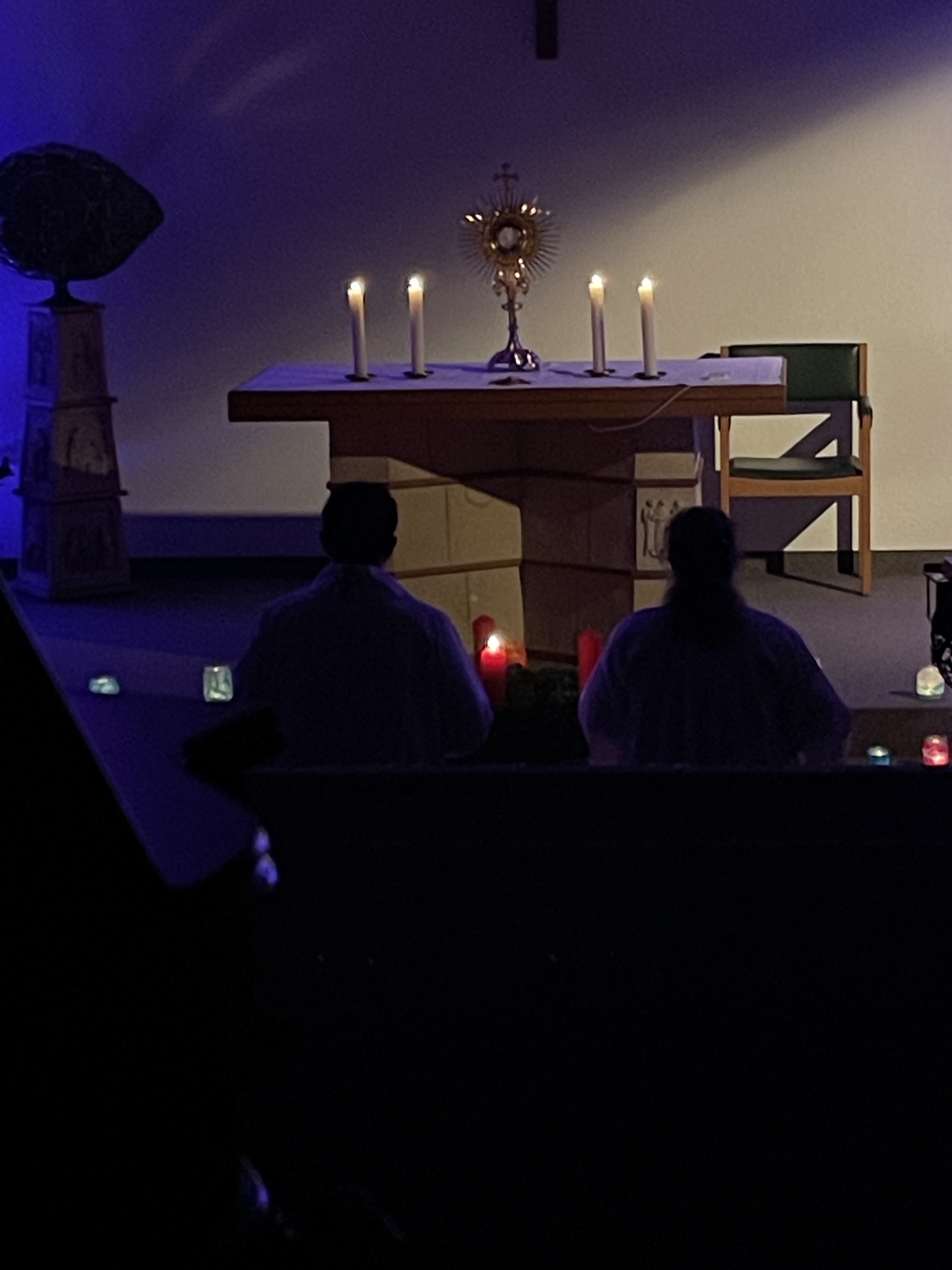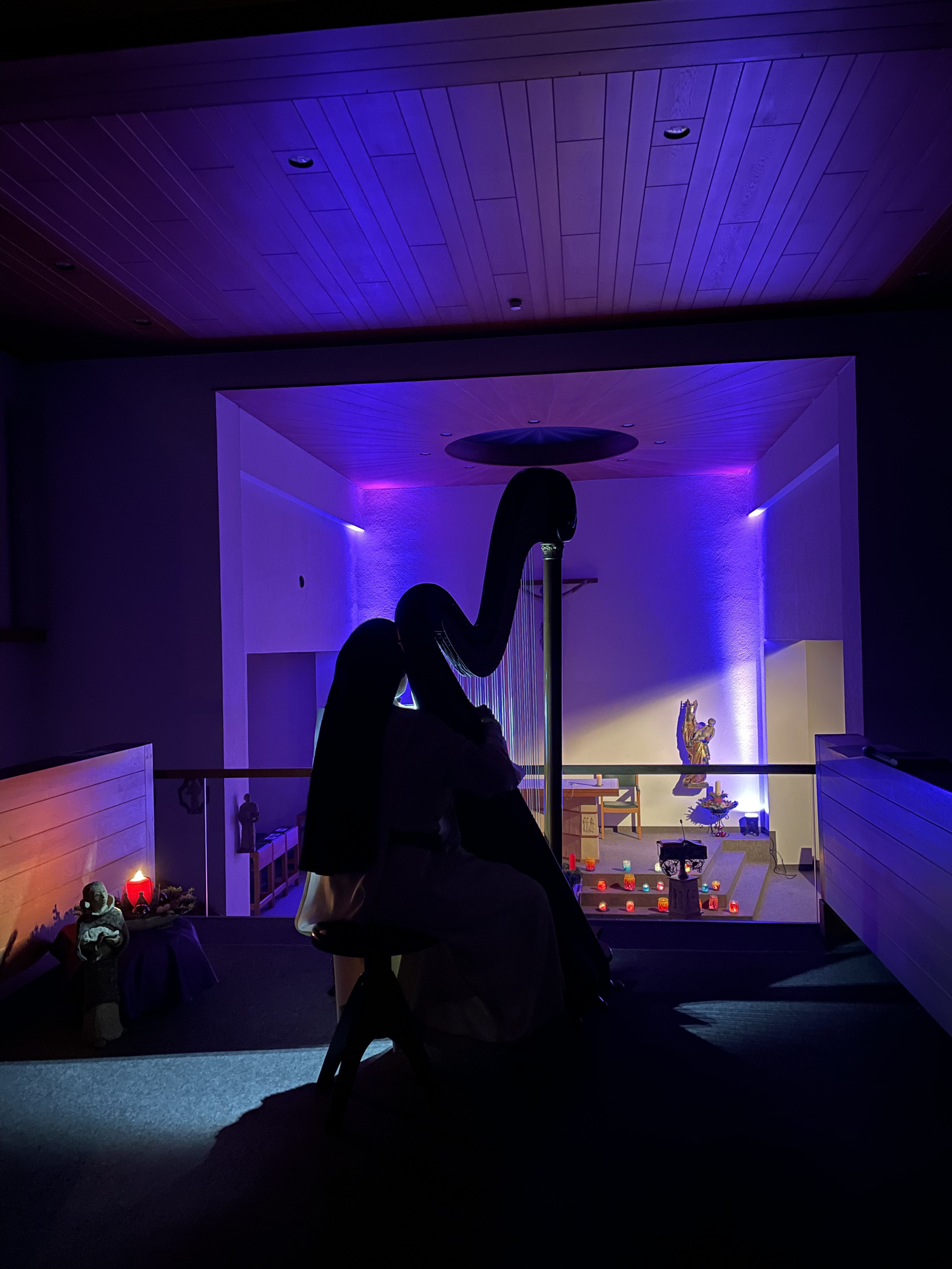 Nach der Komplet schmückten wir gemeinsam noch die Kapelle für unseren Herrn, den wir nach einem Impuls von Br. Abraham, im Allerheiligsten Sakrament des Altares verehrten. Sr. Maria begleitete die Gebetszeit musikalisch mit der Harfe, und während der Anbetung bestand die Möglichkeit zur Hl. Beichte. Zum Abschluss spendete Br. Abraham mit dem Allerheiligsten, allen den Einzelsegen.